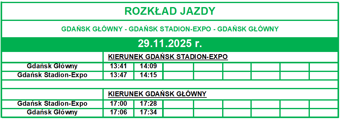 Informujemy, że w dniu 29.11.2025 r. (sobota) w związku z meczem Lechia Gdańsk - Bruk-Bet Termalica Nieciecza rozpoczynającym się o godzinie 14:45 na Stadionie Polsat Plus Gdańsk na odcinku Gdańsk Główny - Gdańsk Stadion-Expo - Gdańsk Główny zostaną uruchomione pociągi.