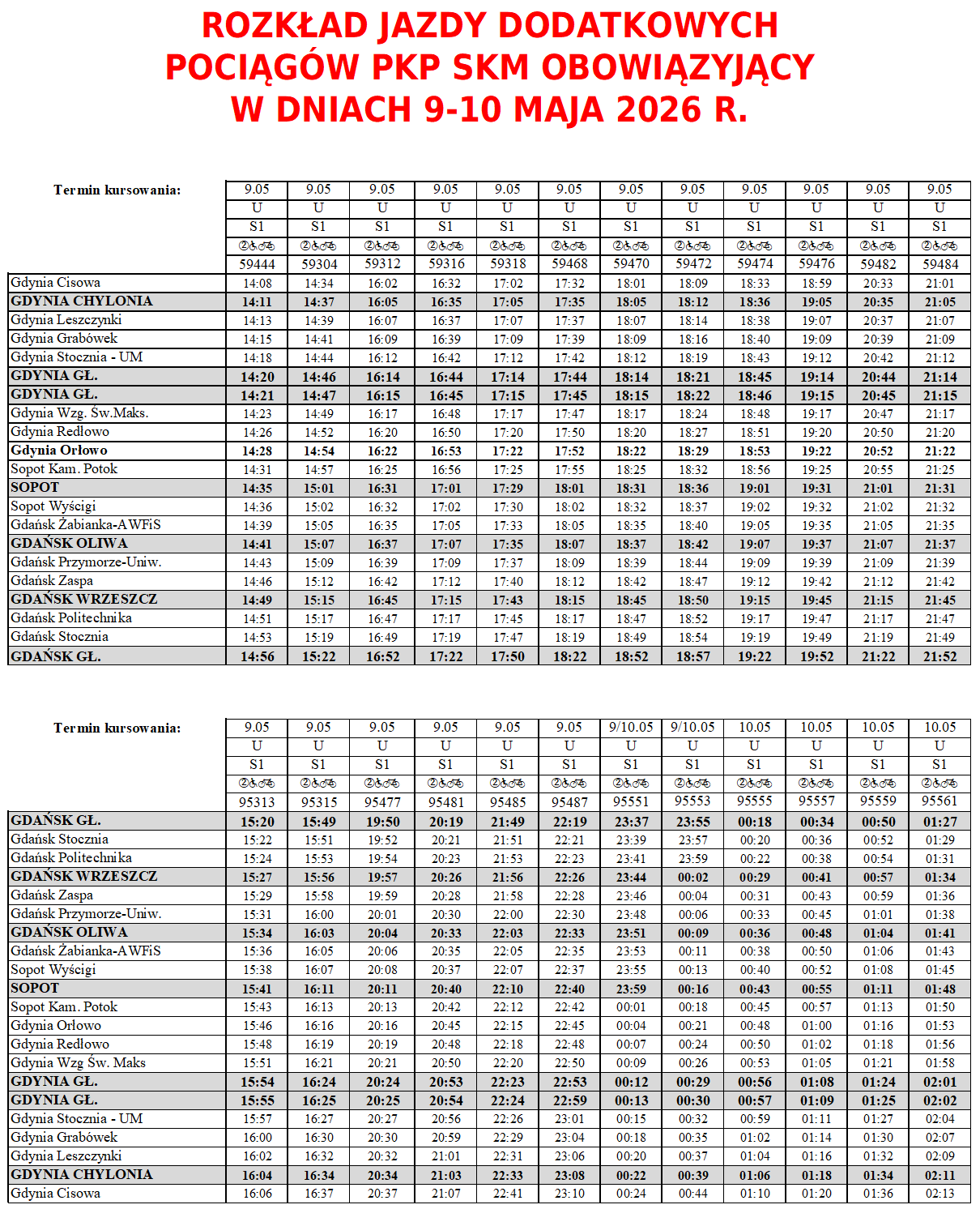 Spółka PKP SKM w Trójmieście informuje, że w dniach 9-10.05.2026 r. zostaną uruchomione dodatkowe pociągi PKP SKM.