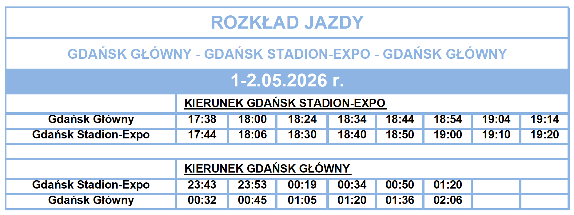 Informujemy, że w związku z koncertem SANAH w dniu 1.05.2026 r. (piątek) rozpoczynającym się o godzinie 20:00 na Stadionie Polsat Plus Gdańsk na odcinku Gdańsk Główny - Gdańsk Stadion-Expo - Gdańsk Główny.