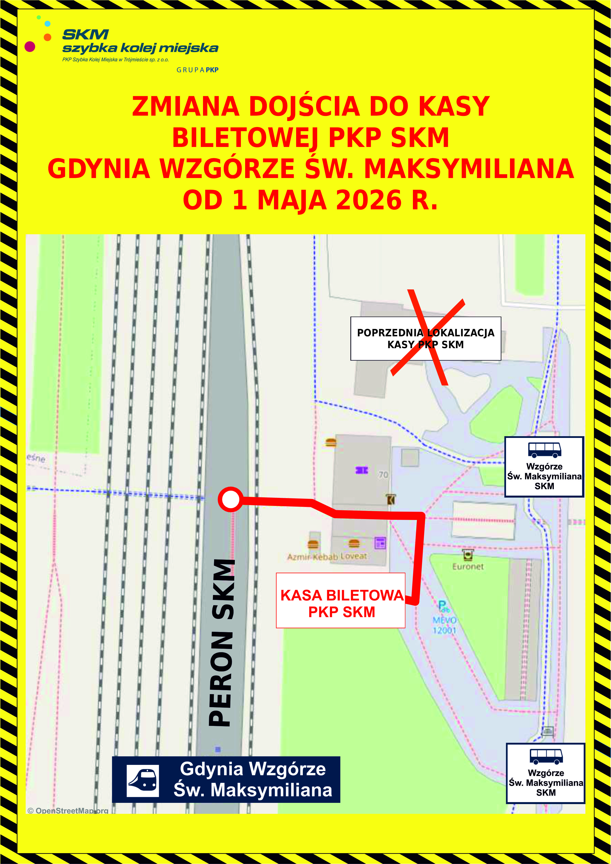 PKP SKM w Trójmieście Sp. z o.o. informuje, że z powodu prac związanych ze zmianą lokalizacji kasy biletowej PKP SKM na przystanku Gdynia Wzgórze Św. Maksymiliana w dniu 29 kwietnia 2026 r. kasa biletowa będzie czynna do godziny 14:00, natomiast w dniu 30 kwietnia 2026 r. (czwartek) będzie nieczynna.