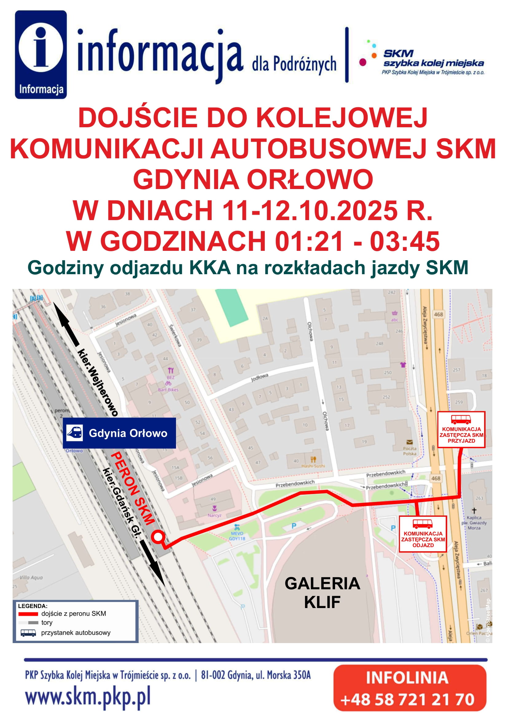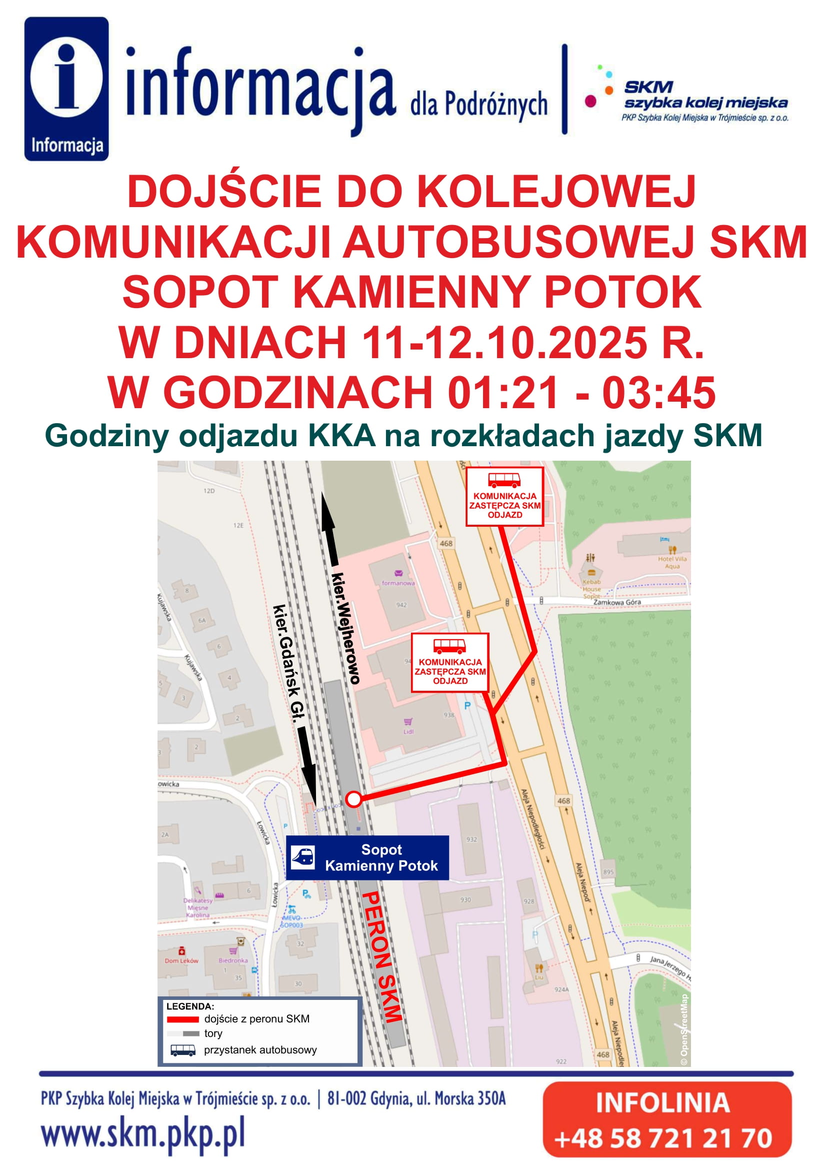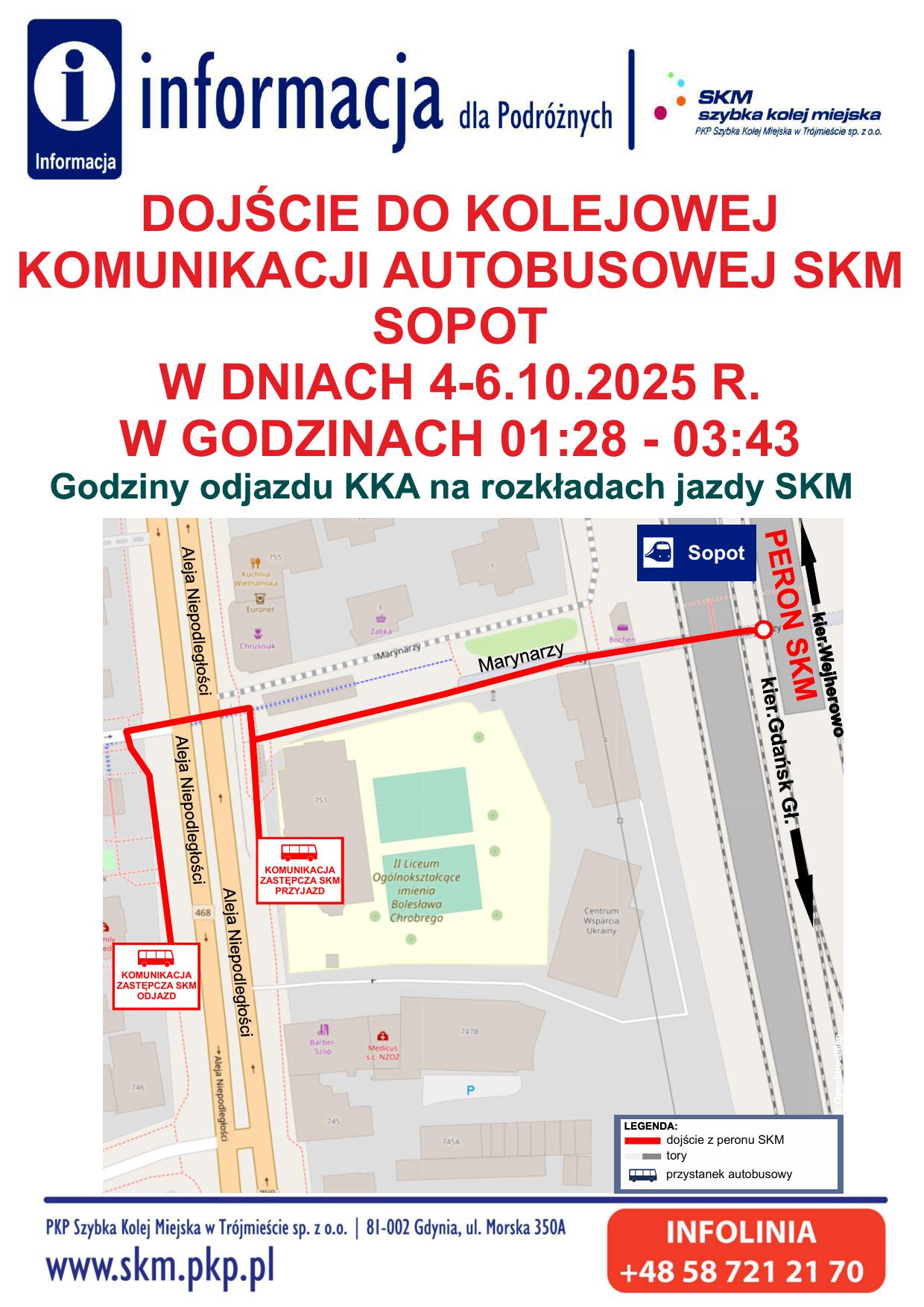 Spółka PKP SKM w Trójmieście informuje, że w godzinach nocnych 4, 5, 6, 11, 12, 13, 18, 19, 20 oraz 25 października 2025 roku na odcinku Sopot - Gdańsk Żabianka AWFiS - Sopot, Sopot - Gdynia Orłowo - Sopot oraz Gdynia Grabówek - Gdynia Wzgórze Św.Maksymiliana - Gdynia Grabówek w związku z koniecznymi do przeprowadzenia pracami serwisowymi oraz modernizacją sieci trakcyjnej zostanie uruchomiona kolejowa komunikacja autobusowa (KKA) jako zastępstwo za niektóre pociągi SKM.