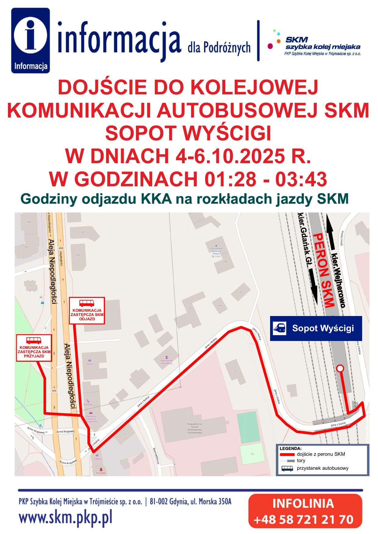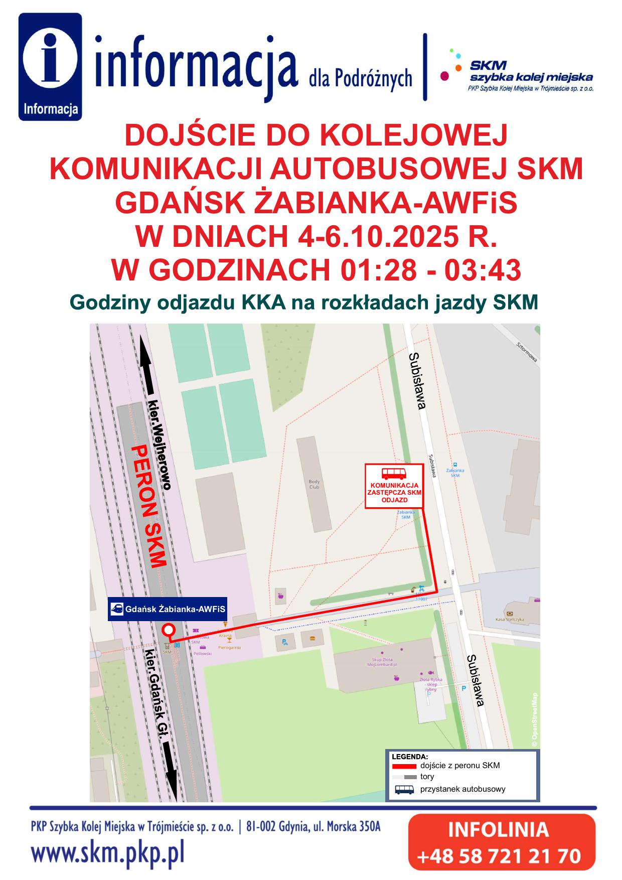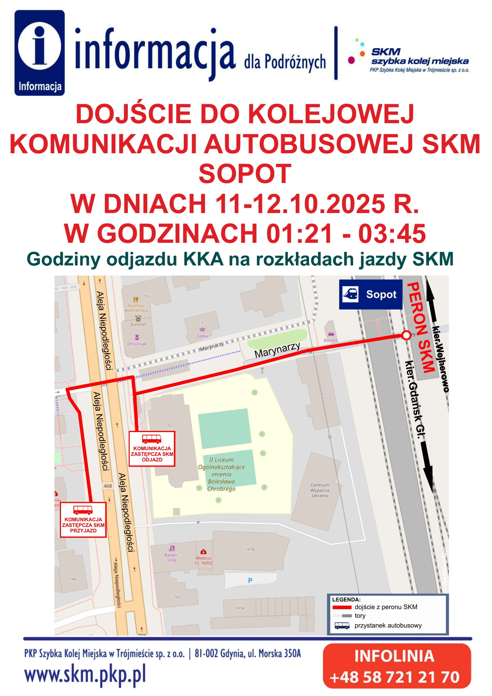 Spółka PKP SKM w Trójmieście informuje, że w godzinach nocnych 4, 5, 6, 11, 12, 13, 18, 19, 20 oraz 25 października 2025 roku na odcinku Sopot - Gdańsk Żabianka AWFiS - Sopot, Sopot - Gdynia Orłowo - Sopot oraz Gdynia Grabówek - Gdynia Wzgórze Św.Maksymiliana - Gdynia Grabówek w związku z koniecznymi do przeprowadzenia pracami serwisowymi oraz modernizacją sieci trakcyjnej zostanie uruchomiona kolejowa komunikacja autobusowa (KKA) jako zastępstwo za niektóre pociągi SKM.