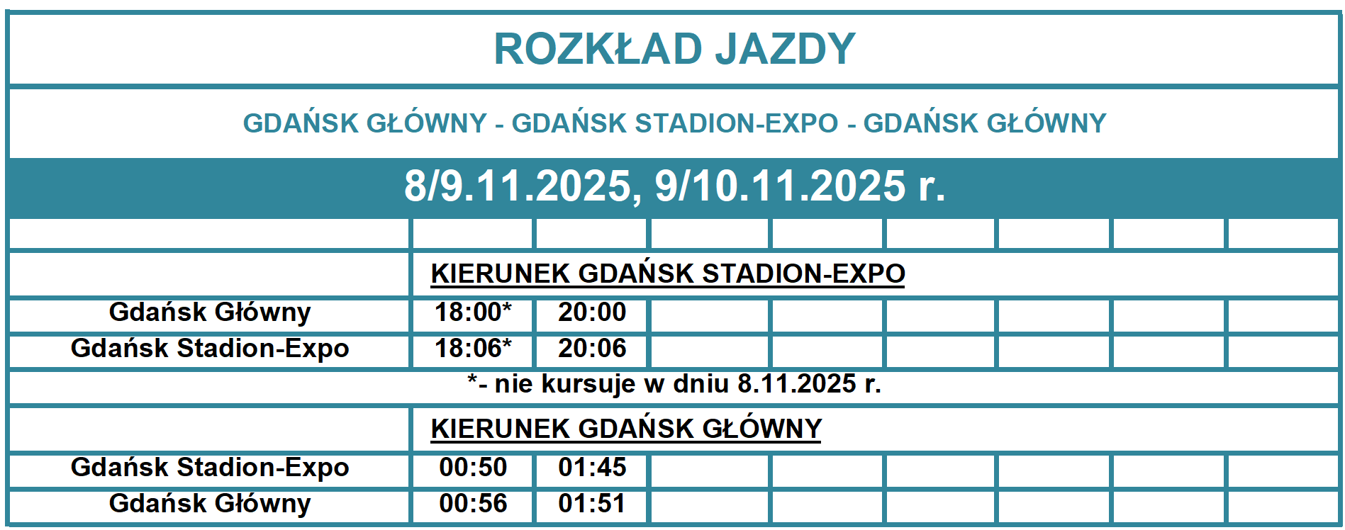 Informujemy, że w związku z festiwalem Inside Seaside w AmberExpo w dniach 8-10 listopada 2025 r. na odcinku Gdańsk Główny - Gdańsk Stadion-Expo - Gdańsk Główny dla uczestników tego wydarzenia zostaną uruchomione bezpłatne pociągi.